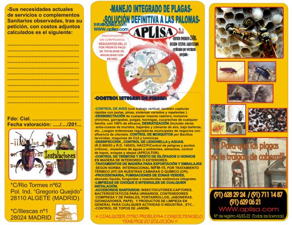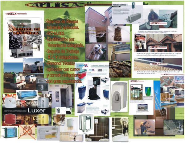 - CONTROL DE AVES (también capturas rápidas con jaulas y pinza) -DESINSECTACION, DESRRATIZACION -DESINFECCION, CONTROL E LEGIONELA Y AGUAS ( R.D. 865/06 Y R.D. 140/06, HACCP, muestreos de aguas y ambientes, control de topos, avispas y abejas (APICULTOR)